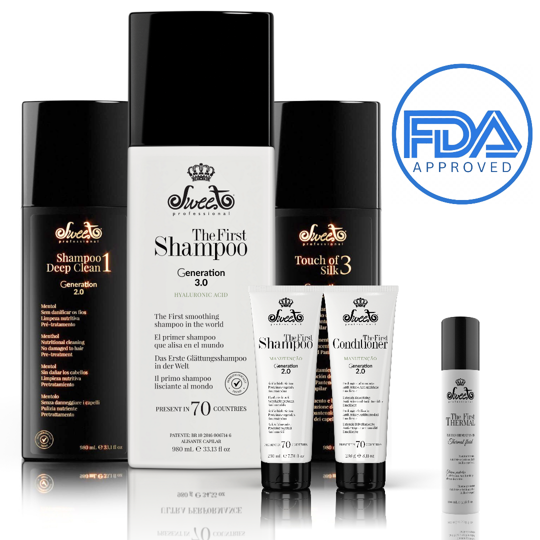 The FIRST SHAMPOO is composed of five different amino acids, that, when combined with the proteins in the hair, creates bonds, modifying the structure of the hair through the interaction of a heat source.